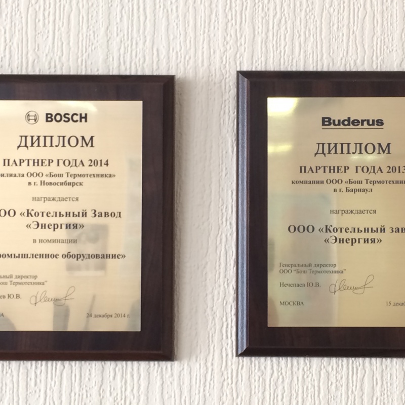 По итогам 2014 года компания ООО «Котельный завод «Энергия» награждена немецкой компаний BOSCH ООО «Бош Термотехника» дипломом Партнер года 2014 за успешную реализацию промышленного отопительного оборудования на территории Сибирского федерального округа.
