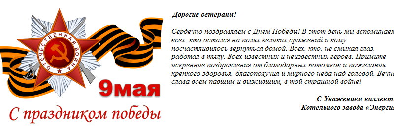 Коллектив Котельного завода "Энергия" сердечно поздравляет дорогих ветеранов с Днем Победы! Вечная слава и память всем павшим и выжившим, в той страшной войне!
