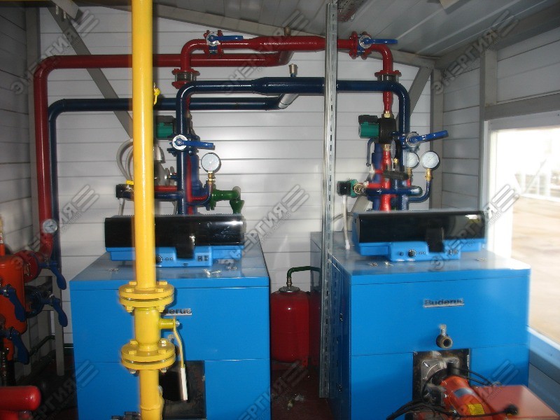 Модульная водогрейная котельная мощностью 380 кВт для отопления. Основное топливо — газ, резервное — дизельное. Котельное оборудование Buderus.
