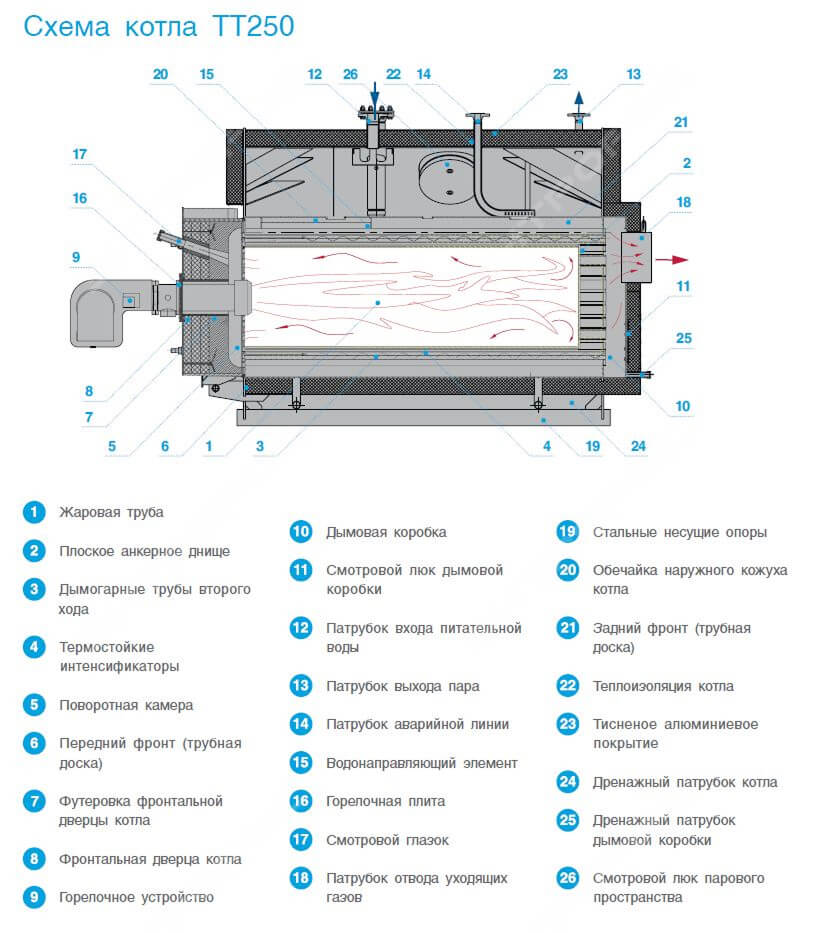 ТЕРМОТЕХНИК ТТ250 — это стальные двухходовые жаротрубные паровые котлы, производительность которых 1000–3000 кг/ч. Они осуществляют выработку насыщенного пара, рабочее давление которого может быть 0,8 МПа или 1,2 МПа. Для работы используется как жидкое, так и газообразное углеводородное топливо.