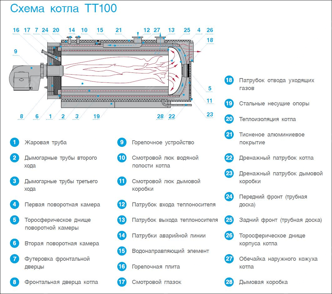 Газовые котлы ТЕРМОТЕХНИК ТТ100 — стальные дымогарно-жаротрубные трехходовые водогрейные котлы, которые изготавливаются в диапазоне мощностей от 1 МВт до 20 МВт. Котлы предназначены для производства горячей воды с максимальной температурой 115 °С и максимальным избыточным рабочим давлением 0,6 МПа.