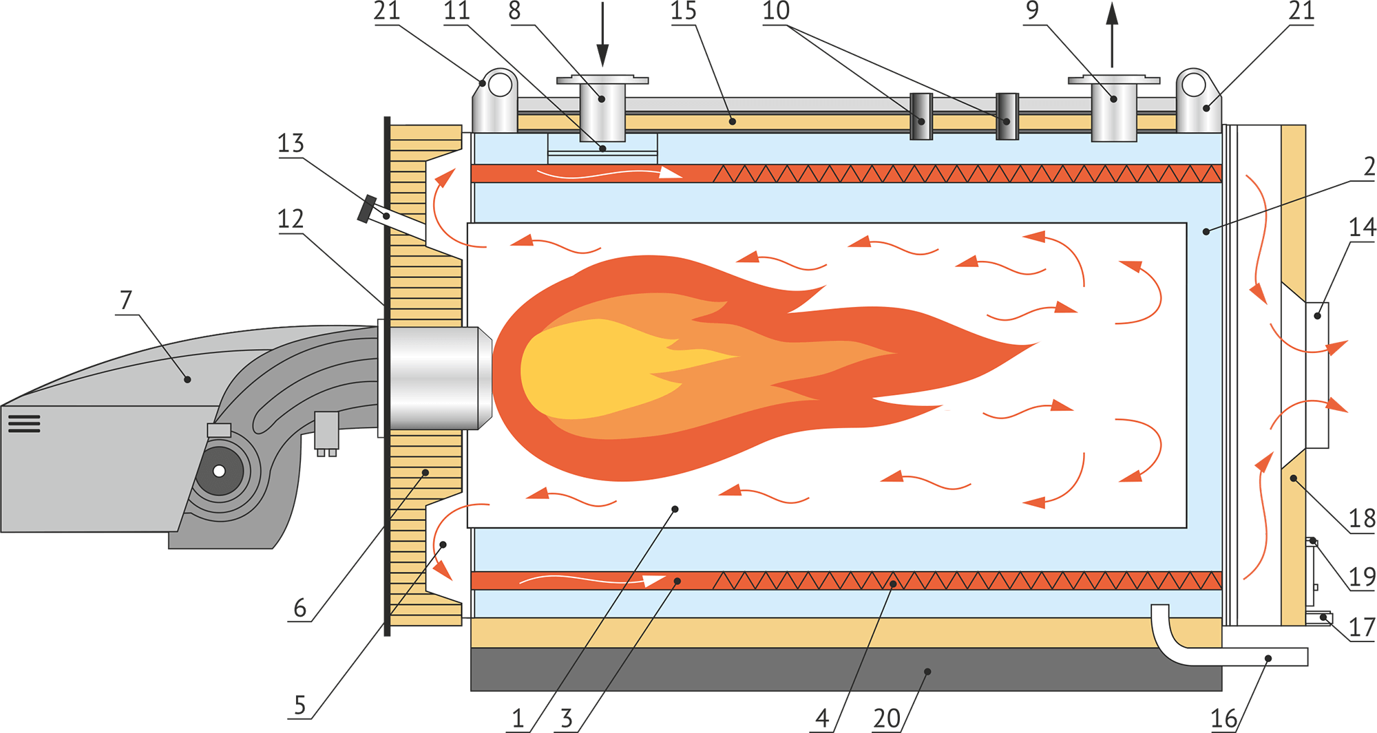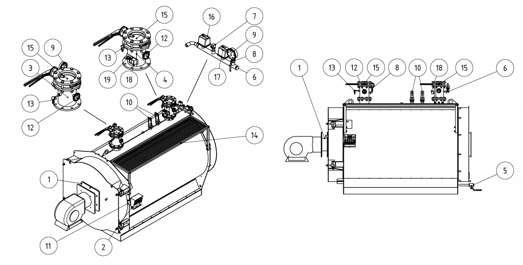 Дымогарные трубы — распределены равномерно вокруг топки. Для увеличения интенсивности теплообмена в дымогарных трубах установлены спиральные турбулизаторы.