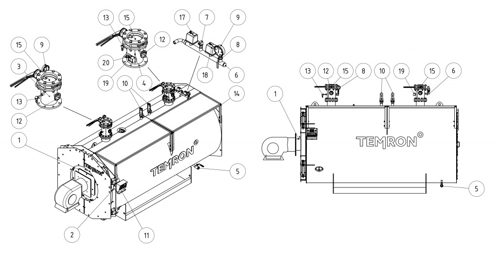 По газовой стороне котел является трехходовым. Топка котла (первый ход газов) представляет собой гладкую либо волнистую жаровую трубу с охлаждаемой поворотной камерой. Второй и третий ходы газов образуют ряды дымогарных труб, концентрически расположенные вокруг топки. Фронтовая поворотная камера между вторым и третьим ходами закрыта двумя симметричными фронтовыми дверцами. В дымогарных трубах третьего хода установлены спиральные турбулизаторы для повышения КПД котла. Отвод газов из котла осуществляется через газовый короб на задней трубной доске. Для предотвращения образования конденсата газовый короб изолирован с внутренней стороны и оснащен дренажем. Котел работает под наддувом. Аэродинамическое сопротивление преодолевается за счет вентилятора горелки. Разрежение за котлом обеспечивается самотягой дымовой трубы.
