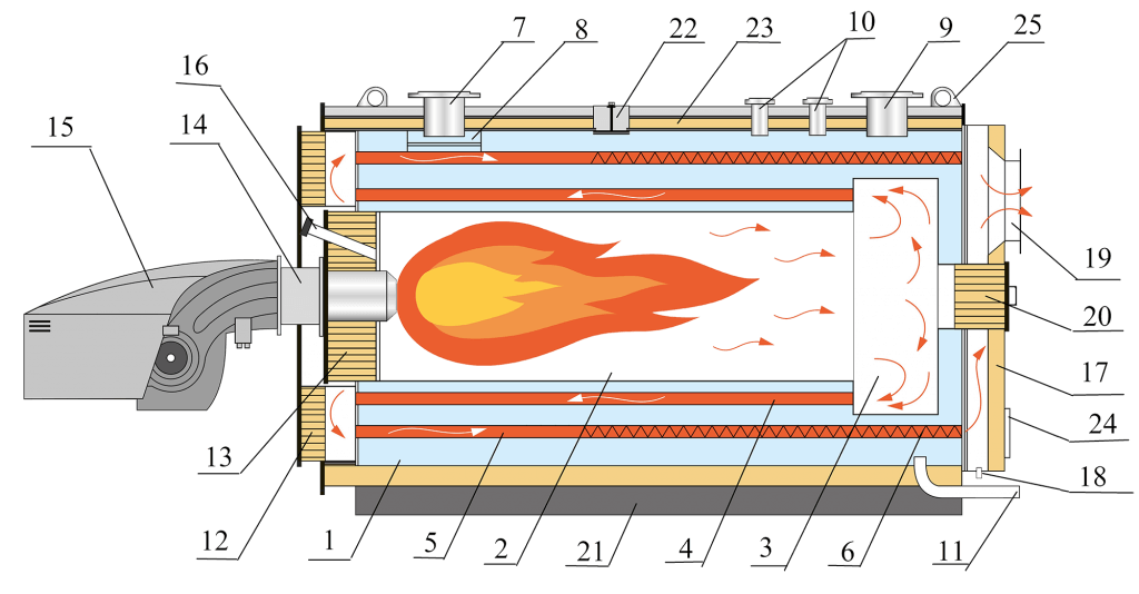 Котел относится к классу жаротрубных котлов с дымогарными трубами.